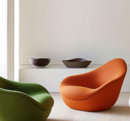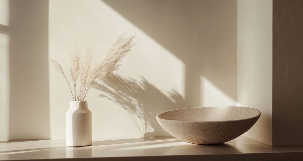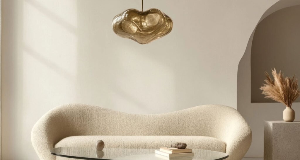 Modern minimalist interior design featuring elegant organic shapes harmonizing comfort with style in neutral tones.